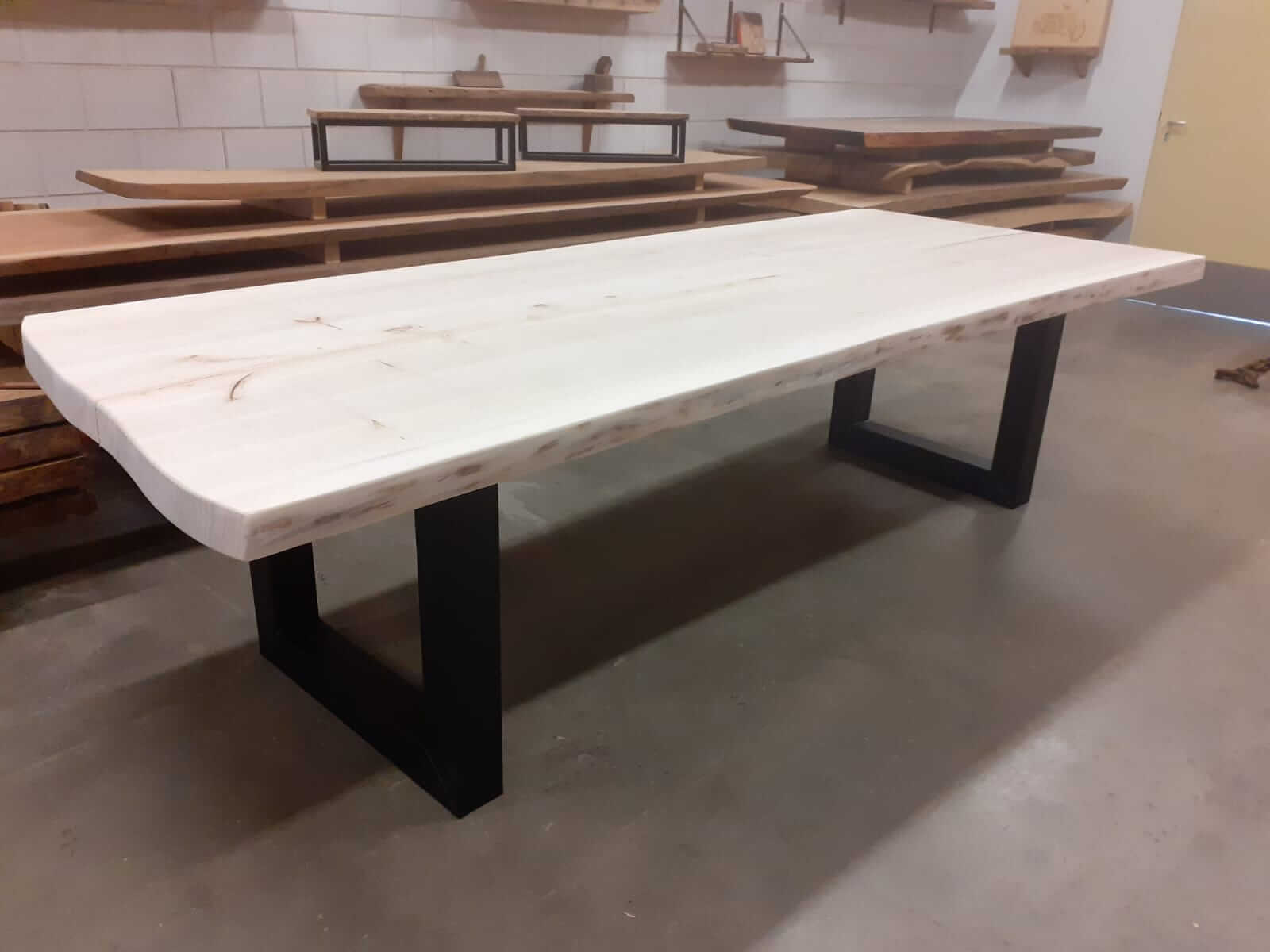 Massieve tafel van Populier boomstamblad met zwart gecoate U of X poot.